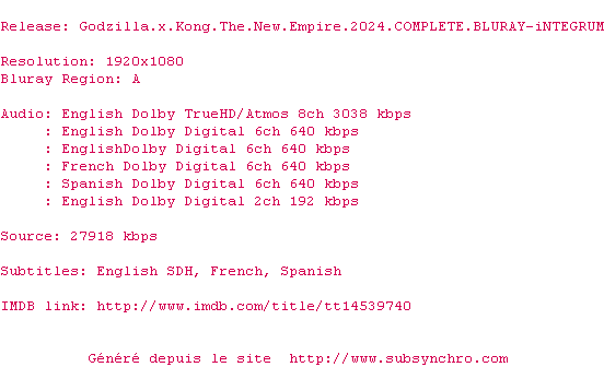 Voir le nfo de la release Godzilla.X.Kong.The.New.Empire.2024.COMPLETE.BLURAY-iNTEGRUM