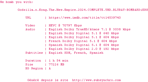 Voir le nfo de la release Godzilla.X.Kong.The.New.Empire.2024.COMPLETE.UHD.BLURAY-B0MBARDiERS