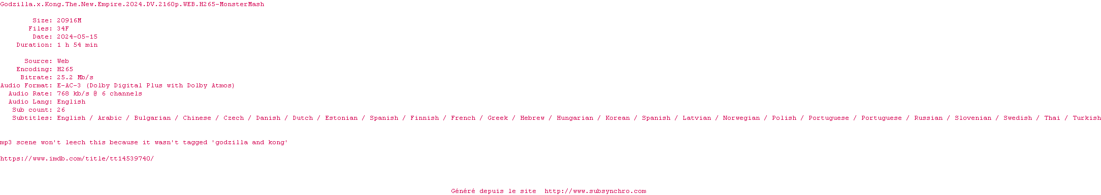Voir le nfo de la release Godzilla.X.Kong.The.New.Empire.2024.DV.2160p.WEB.H265-MonsterMash