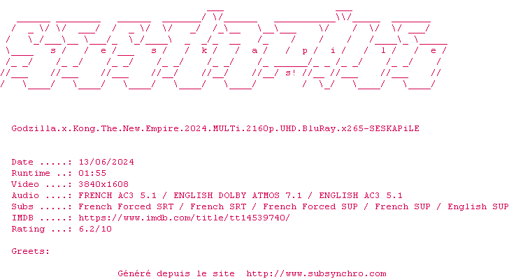 Voir le nfo de la release Godzilla.X.Kong.The.New.Empire.2024.MULTi.2160p.UHD.BluRay.x265-SESKAPiLE