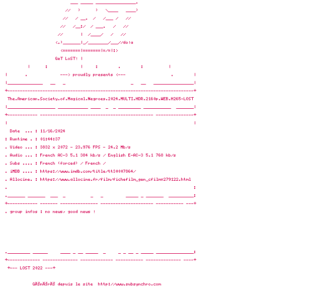Voir le nfo de la release The.American.Society.Of.Magical.Negroes.2024.MULTI.HDR.2160p.WEB.H265-LOST