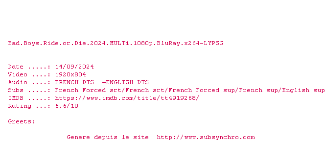 Voir le nfo de la release Bad.Boys.Ride.Or.Die.2024.MULTi.1080p.BluRay.x264-LYPSG