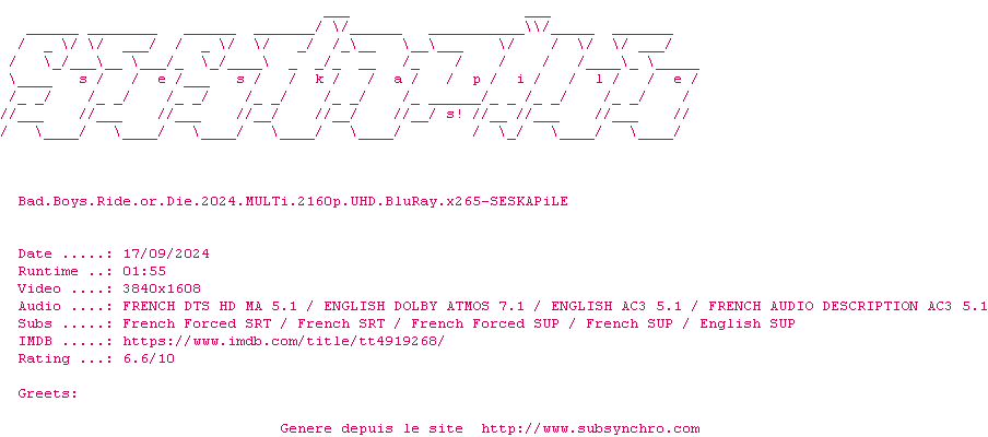 Voir le nfo de la release Bad.Boys.Ride.Or.Die.2024.MULTi.2160p.UHD.BluRay.x265-SESKAPiLE