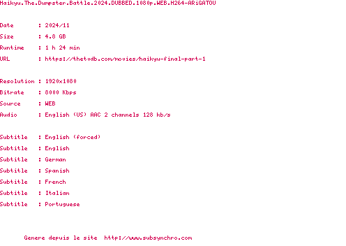 | MaitreAnonyme | Haikyu.La.Guerre.Des.Poubelles.2024.FR.SME.WEB.FR-MaitreAnonyme OpenSubtitles | 0 fichier |