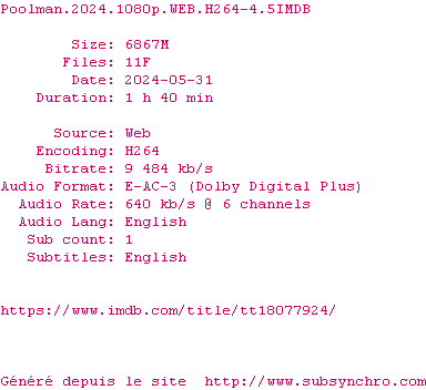 Voir le nfo de la release Poolman.2024.1080p.WEB.H264-4.5IMDB