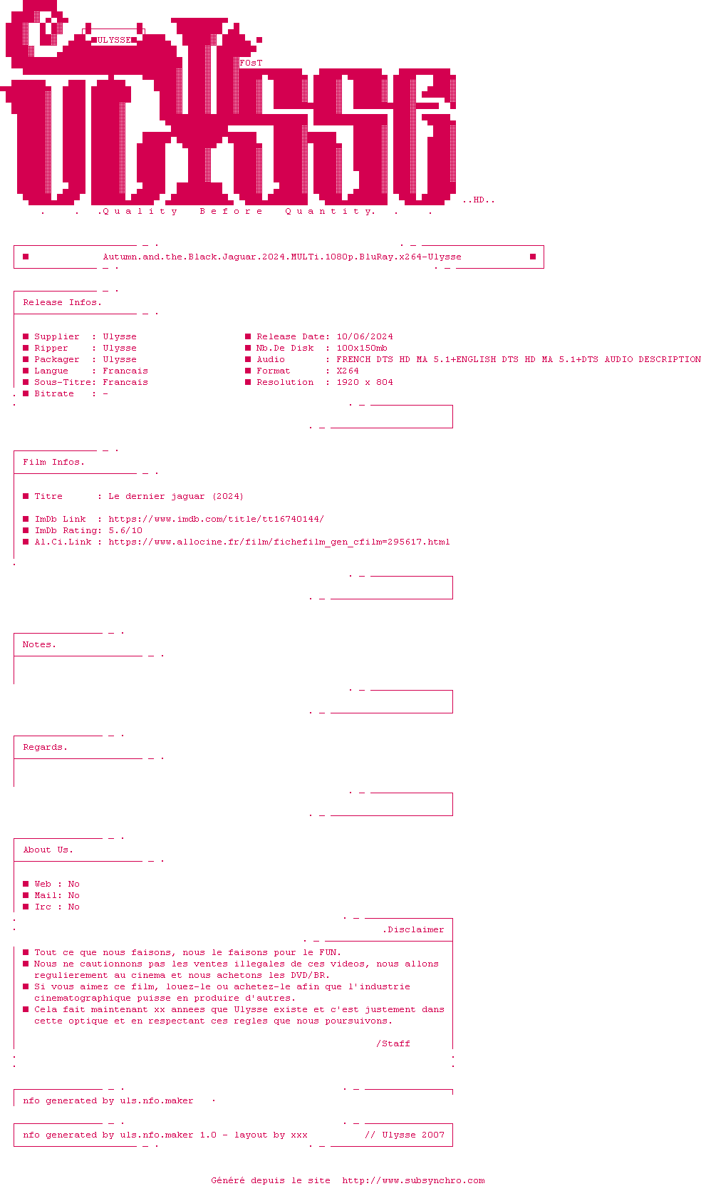 Voir le nfo de la release Autumn.And.The.Black.Jaguar.2024.MULTi.1080p.BluRay.x264-Ulysse