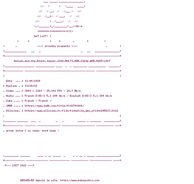 Voir le nfo de la release Autumn.And.The.Black.Jaguar.2024.MULTI.HDR.2160p.WEB.H265-LOST