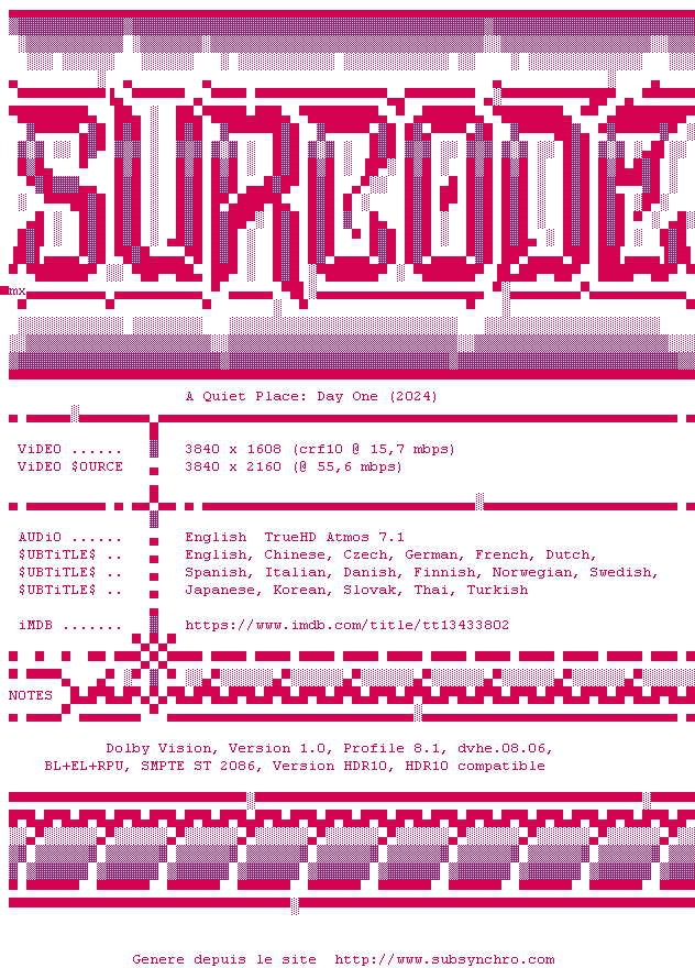 Voir le nfo de la release A.Quiet.Place.Day.One.2024.2160p.UHD.BluRay.x265-SURCODE
