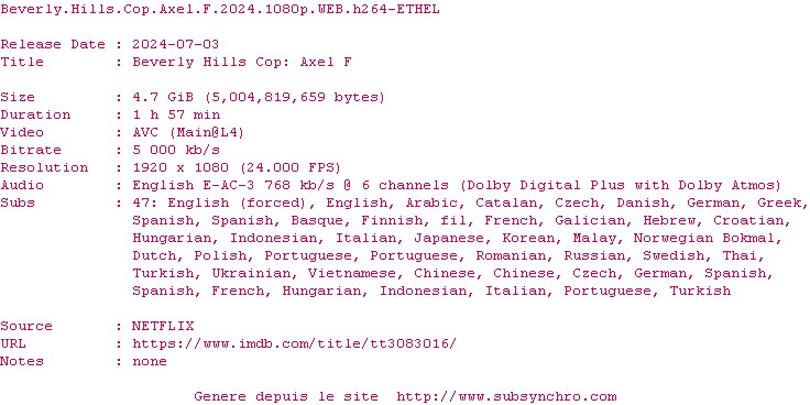Voir le nfo de la release Beverly.Hills.Cop.Axel.F.2024.1080p.WEB.H264-ETHEL