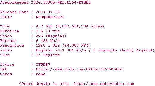 | Voir le nfo de la release Dragonkeeper.2024.1080p.WEB.H264-ETHEL | ETHEL | Dragonkeeper.2024.1080p.WEB.H264-ETHEL OpenSubtitles | 0 fichier |
