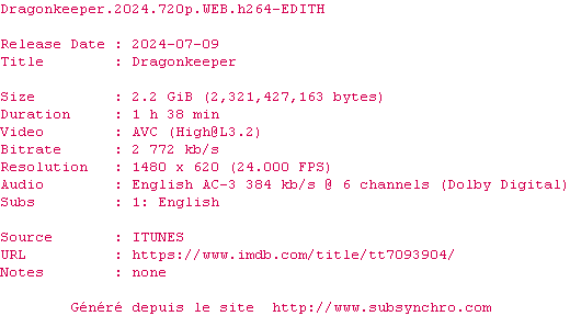 | Voir le nfo de la release Dragonkeeper.2024.720p.WEB.H264-EDITH | EDITH | Dragonkeeper.2024.720p.WEB.H264-EDITH OpenSubtitles | 0 fichier | ||