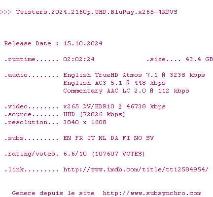 Voir le nfo de la release Twisters.2024.2160p.UHD.BluRay.x265-4KDVS