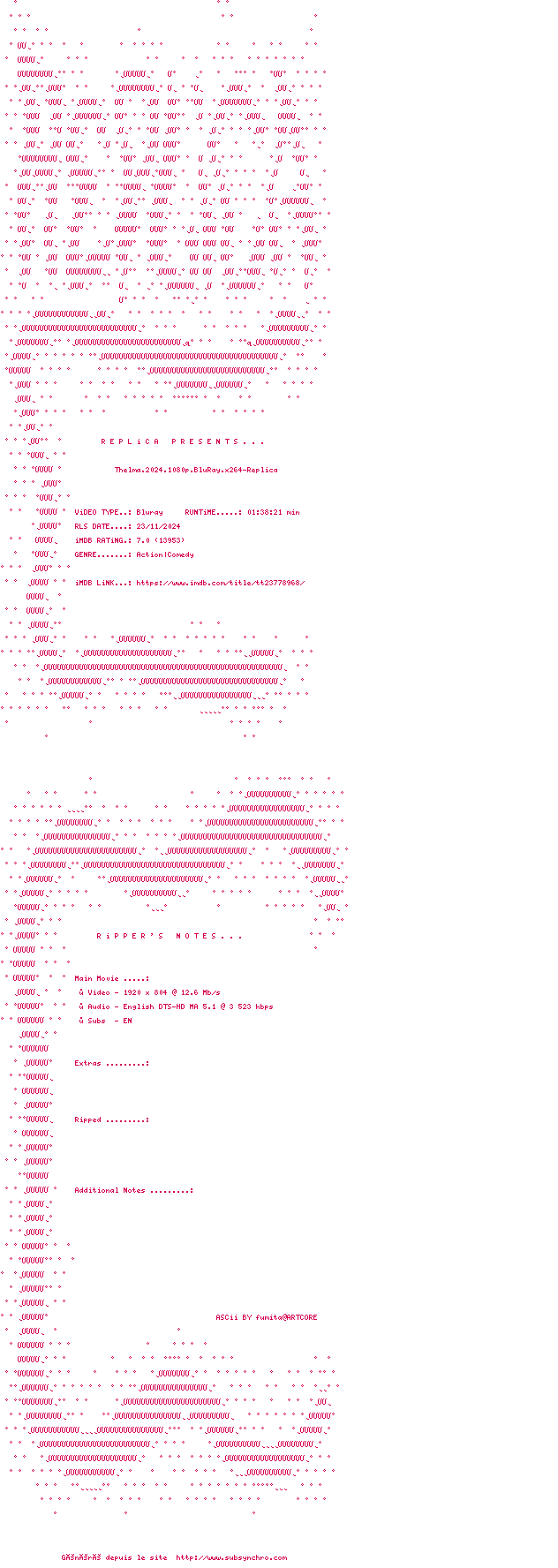 | Voir le nfo de la release Thelma.2024.1080p.BluRay.x264-Replica | Replica | Thelma.2024.1080p.BluRay.x264-Replica OpenSubtitles | 0 fichier |