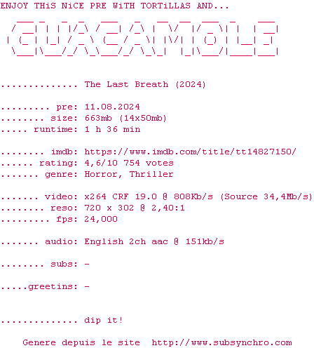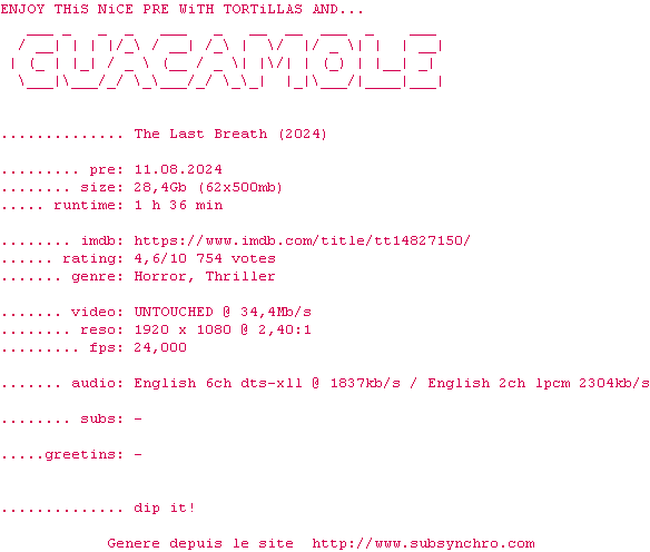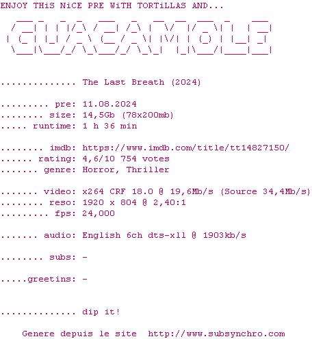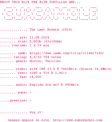 Voir le nfo de la release The.Last.Breath.2024.BDRiP.x264-GUACAMOLE