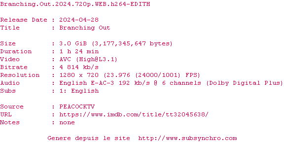 | Voir le nfo de la release Branching.Out.2024.720p.WEB.H264-EDITH | EDITH | Branching.Out.2024.720p.WEB.H264-EDITH OpenSubtitles | 0 fichier |