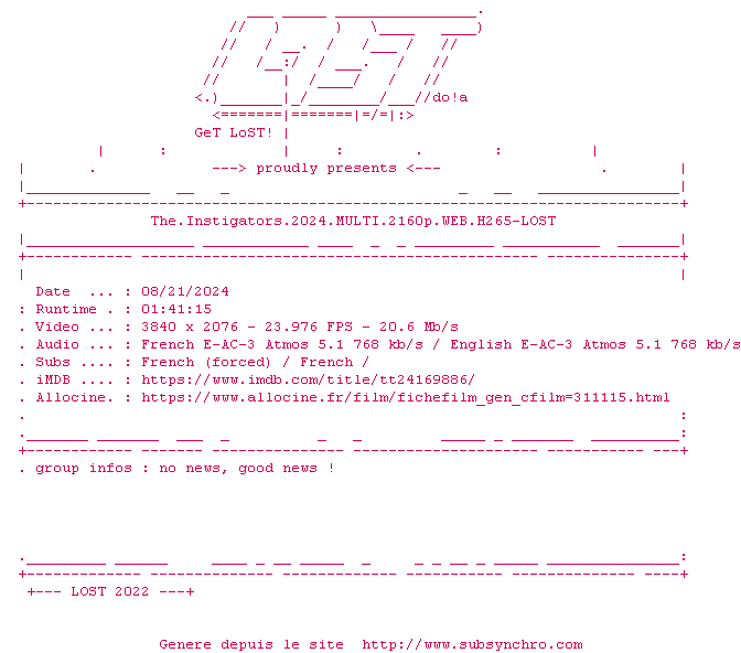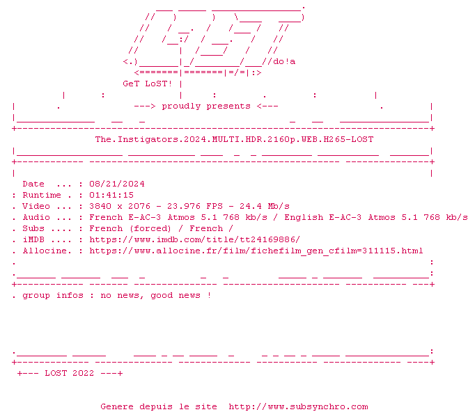 Voir le nfo de la release The.Instigators.2024.MULTI.2160p.WEB.H265-LOST