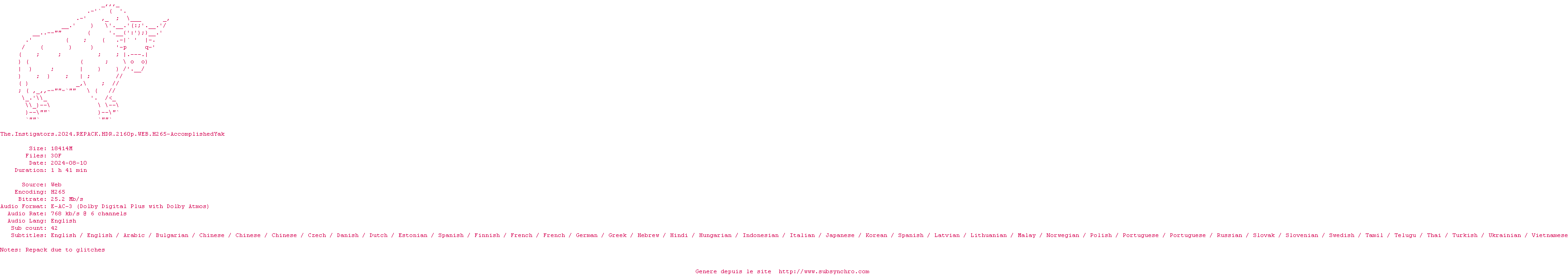 Voir le nfo de la release The.Instigators.2024.HDR.2160p.WEB.H265-AccomplishedYak