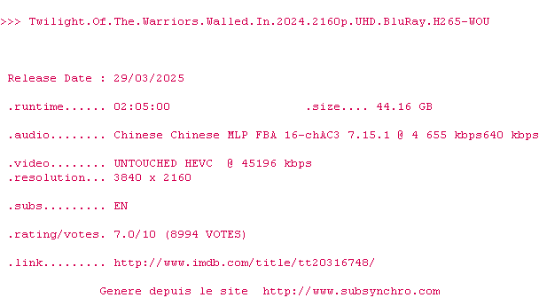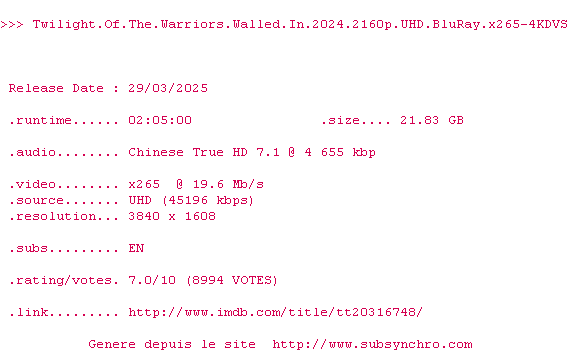 Voir le nfo de la release Twilight.Of.The.Warriors.Walled.In.2024.2160p.UHD.BluRay.x265-4KDVS