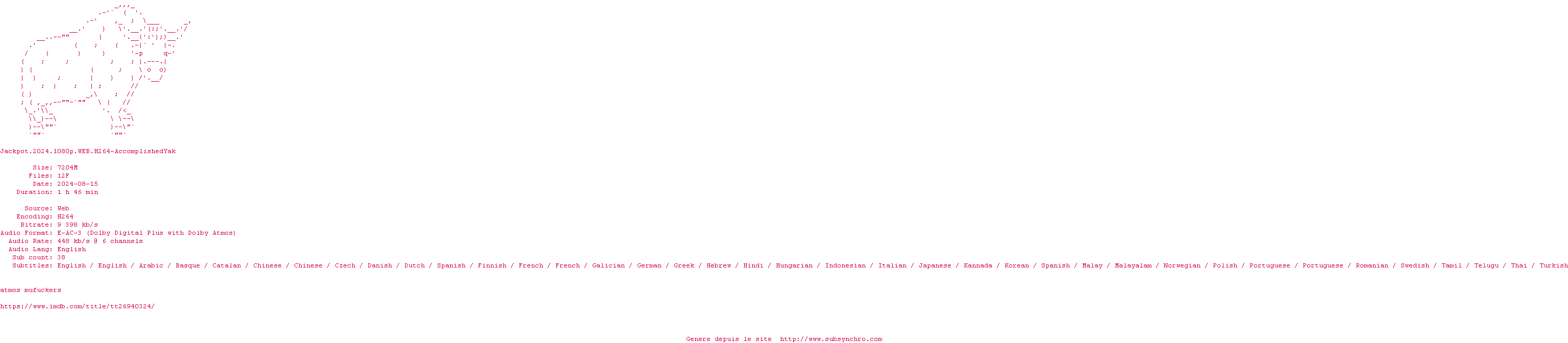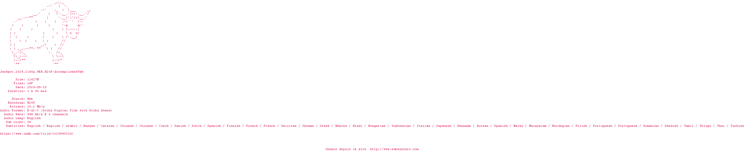 Voir le nfo de la release Jackpot.2024.HDR.2160p.WEB.H265-AccomplishedYak