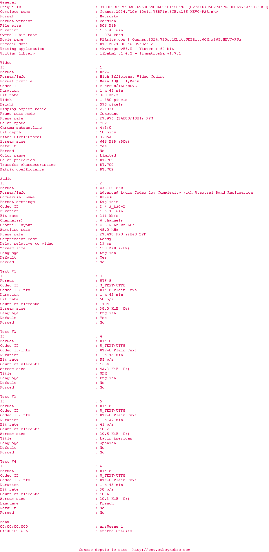 Voir le nfo de la release Gunner.2024.720p.10bit.WEBRip.6CH.x265.HEVC-PSA