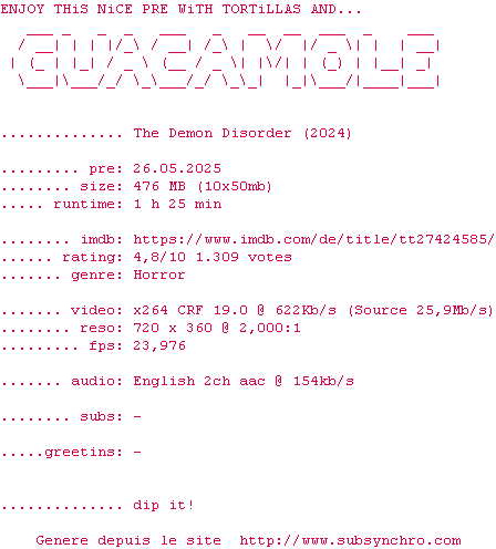Voir le nfo de la release The.Demon.Disorder.2024.BDRiP.x264-GUACAMOLE