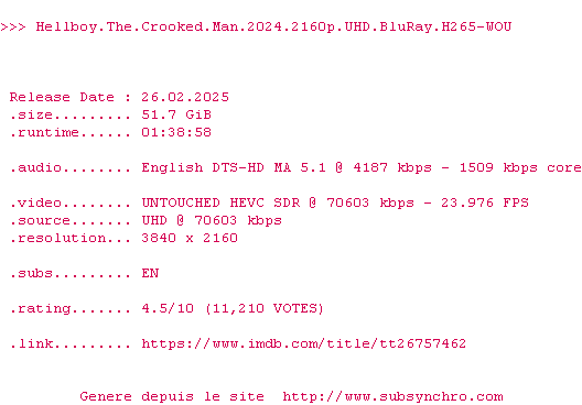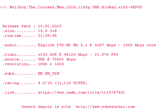 Voir le nfo de la release Hellboy.The.Crooked.Man.2024.2160p.UHD.BluRay.x265-4KDVS