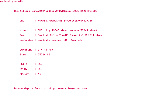 Voir le nfo de la release The.Killers.Game.2024.2160p.UHD.BluRay.H265-MALUS
