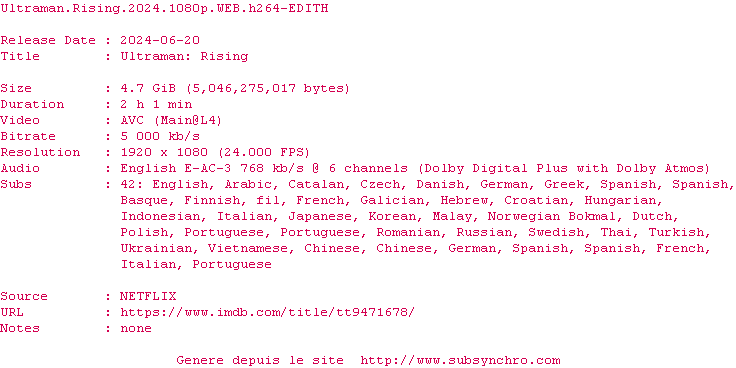 Voir le nfo de la release Ultraman.Rising.2024.1080p.WEB.H264-EDITH