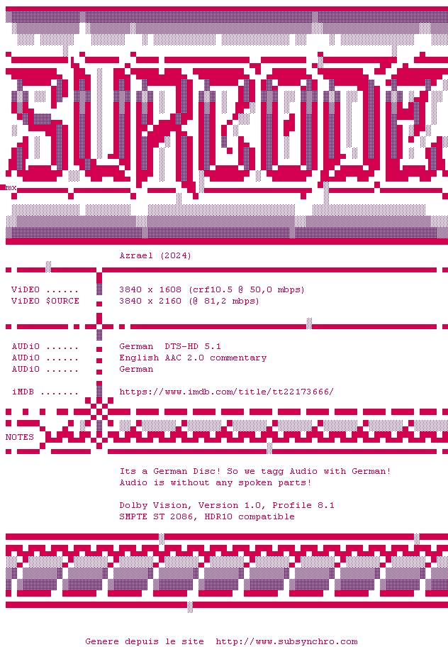 Voir le nfo de la release Azrael.2024.2160p.UHD.BluRay.x265-SURCODE