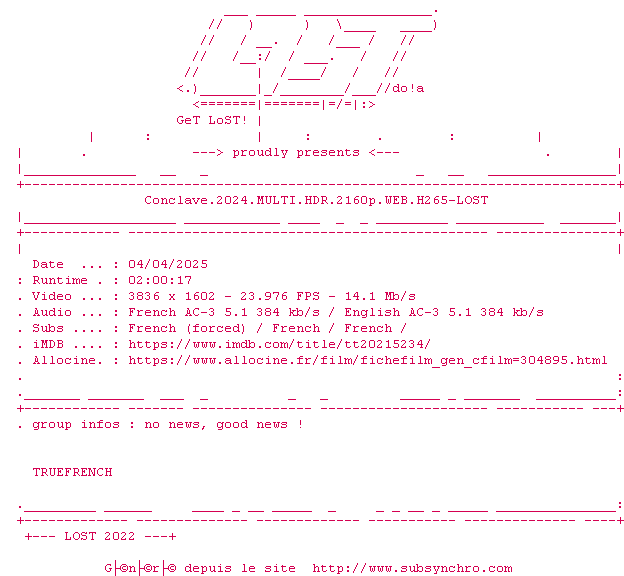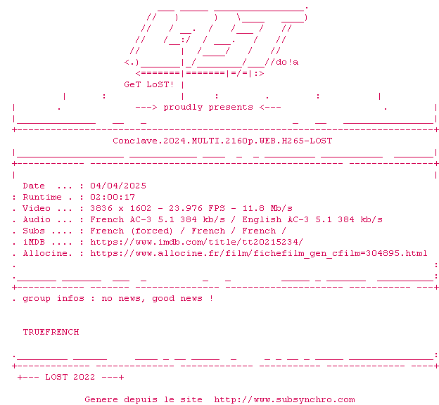 Voir le nfo de la release Conclave.2024.MULTI.1080p.WEB.H264-LOST
