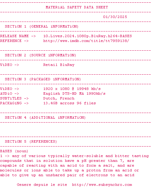 Voir le nfo de la release 10.Lives.2024.MULTi.COMPLETE.BLURAY-4FR