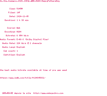 | Voir le nfo de la release In.The.Summers.2024.1080p.WEB.H264-HappyFathersDay | HappyFathersDay | In.The.Summers.2024.1080p.WEB.H264-HappyFathersDay OpenSubtitles | 0 fichier | ||
