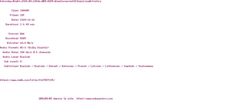 Voir le nfo de la release Saturday.Night.2024.2160p.WEB.H265-WiseCormorantOfInspiringArtistry