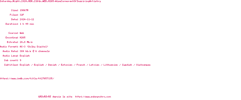 Voir le nfo de la release Saturday.Night.2024.HDR.2160p.WEB.H265-WiseCormorantOfInspiringArtistry
