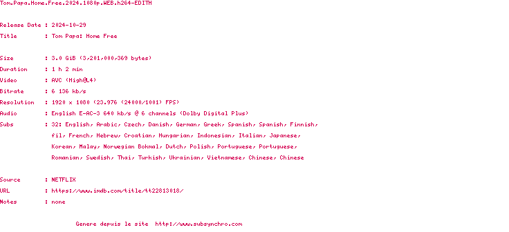 | Voir le nfo de la release Tom.Papa.Home.Free.2024.1080p.WEB.H264-EDITH | EDITH | Tom.Papa.Home.Free.2024.1080p.WEB.H264-EDITH OpenSubtitles | 0 fichier | ||