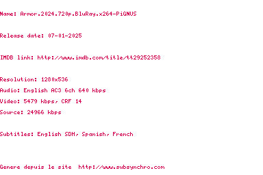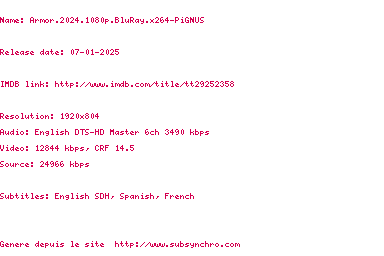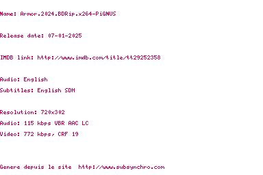 Voir le nfo de la release Armor.2024.1080p.BluRay.x264-PiGNUS