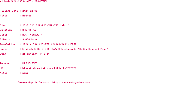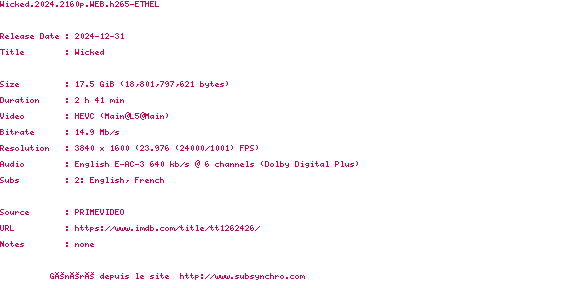 Voir le nfo de la release Wicked.2024.HDR.2160p.WEB.H265-ETHEL
