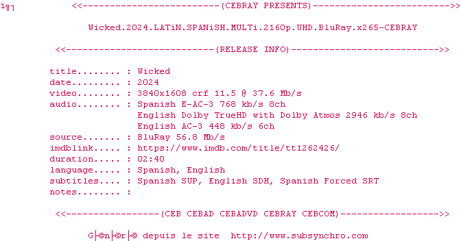 Voir le nfo de la release Wicked.2024.LATiN.SPANiSH.MULTi.2160p.UHD.BluRay.x265-CEBRAY