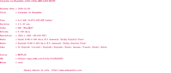 | KHN | Sikandar.Ka.Muqaddar.2024.720p.NF.WEB-DL.DDP5.1.H.264-KHN OpenSubtitles | 0 fichier |