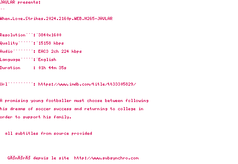 | Voir le nfo de la release When.Love.Strikes.2024.2160p.WEB.H265-JAVLAR | JAVLAR | When.Love.Strikes.2024.2160p.WEB.H265-JAVLAR OpenSubtitles La release When.Love.Strikes.2024.2160p.WEB.H265-JAVLAR est en 4K | 0 fichier | ||