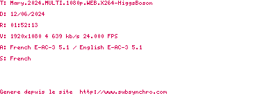 | Voir le nfo de la release Mary.2024.MULTI.1080p.WEB.x264-HiggsBoson | HiggsBoson | Mary.2024.MULTI.1080p.WEB.x264-HiggsBoson OpenSubtitles | 0 fichier | ||