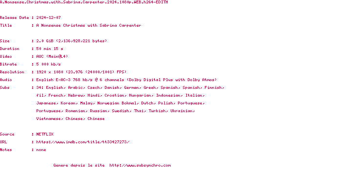Voir le nfo de la release A.Nonsense.Christmas.With.Sabrina.Carpenter.2024.1080p.WEB.H264-EDITH