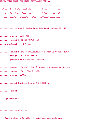 Voir le nfo de la release Ape.X.Mecha.Ape.New.World.Order.2024.720p.BluRay.x264-GUACAMOLE