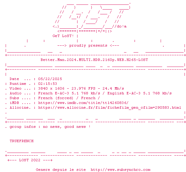 Voir le nfo de la release Better.Man.2024.MULTI.HDR.2160p.WEB.H265-LOST