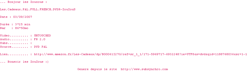 Voir le nfo de la release Les.Cadeaux.FRENCH.DVDRiP.XViD-ZouZouS
