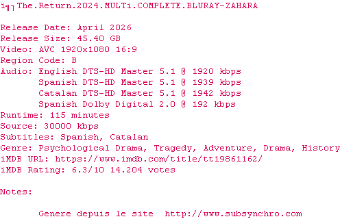 Y avez-vous pense ? Nous proposons déjà 1579 sous-titres pour le film The Return, le retour d'Ulysse. Avez-vous essaye de voir si ces sous-titres etaient compatibles avec cette release ? On vous laisse le soin de tester cela pour nous et de contribuer au site en postant le sous-titre en cas de compatiblite constatee !