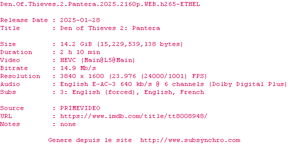 Le commentaire de SubSynchro Commente par SubSynchro (594), Le Dimanche 19 Janvier 2025 à 17h38 Dans ce film bah tout est un peu « plus » que ce que l’on a l'habitude de voir dans les autres films : ce sont de sacrés gangsters, qui font un énorme coup dans une région idyllique et conduisant de magnifiques voitures ! Une phrase et tu es conquis ! C’est amusant de voir comme le film passe vite... Ça sous-entend que l’on a pris du plaisir à le regarder ! Y aura-t-il une différence de qualité en le voyant au cinéma sur un écran géant (comme moi) ou chez soi sur une télé classique ? En tout cas moi et ma chérie avons passé un bon moment ! (Euh un « Super bon moment », tout es plus que d’habitude) PS :  Il y aura un petit fichier FORCED même pour les versions françaises pour quand il y a des étrangers qui parlent ! 8 / 10 0 0