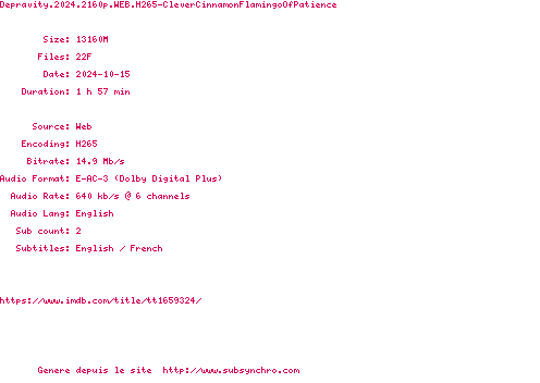 Voir le nfo de la release Depravity.2024.2160p.WEB.H265-CLEVERCiNNAMONFLAMiNGOOFPATiENCE