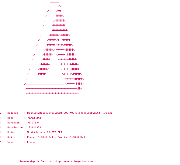| Voir le nfo de la release Biggest.Heist.Ever.2024.DOC.MULTI.1080p.WEB.x264-PENROSE | PENROSE | Biggest.Heist.Ever.2024.DOC.MULTI.1080p.WEB.x264-PENROSE OpenSubtitles | 0 fichier | ||