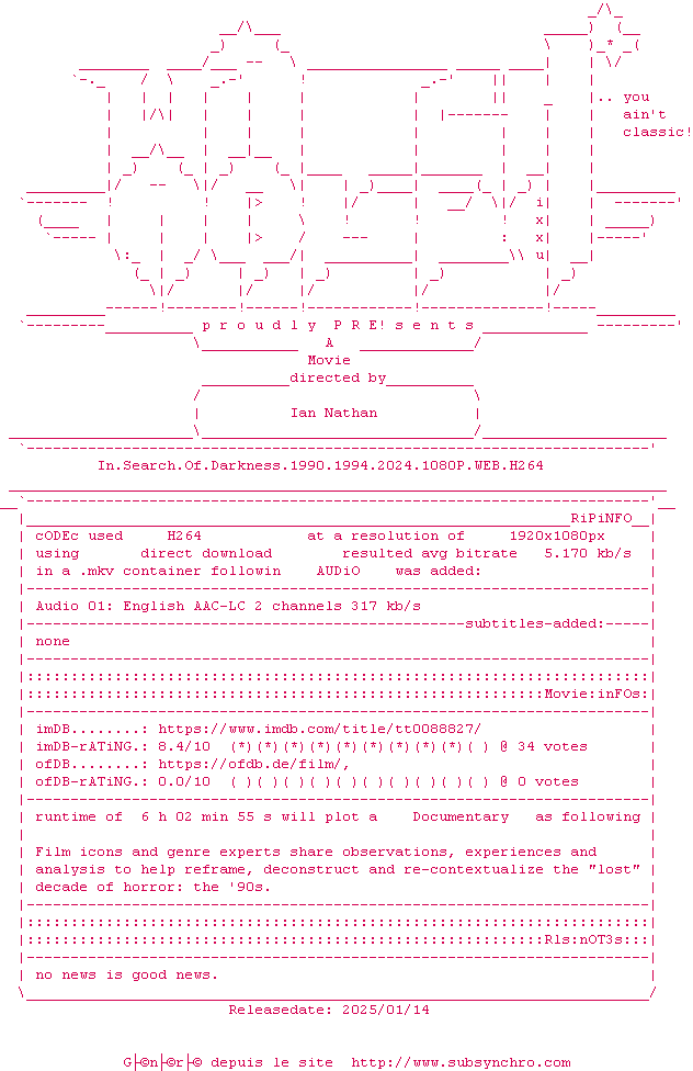 | Voir le nfo de la release In.Search.Of.Darkness.1990.1994.2024.1080P.WEB.H264-WATCHABLE | WATCHABLE | In.Search.Of.Darkness.1990.1994.2024.1080P.WEB.H264-WATCHABLE OpenSubtitles | 0 fichier |